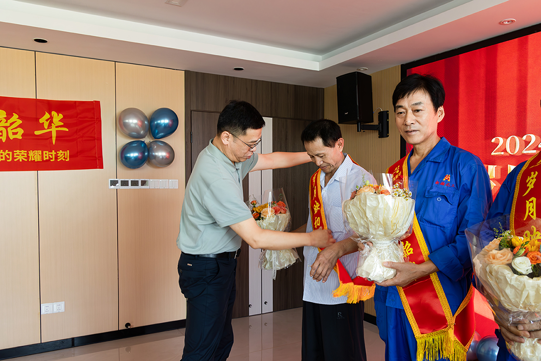 紧接着,公司副总经理汤浩亲自为每位退休职工佩戴上象征荣誉与尊重的光荣退休绶带,并颁发光荣退休牌匾及鲜花,现场掌声雷动,每一声掌声都是对他们辛勤付出的赞誉。
